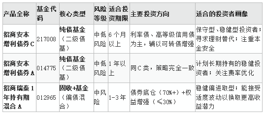 在复杂多变的市场环境中,招商安本增利债券(217008、014775)与招商瑞泰1年持有期混合(012965)这三只产品构成了一个层次分明、覆盖全面的稳健理财解决方案: