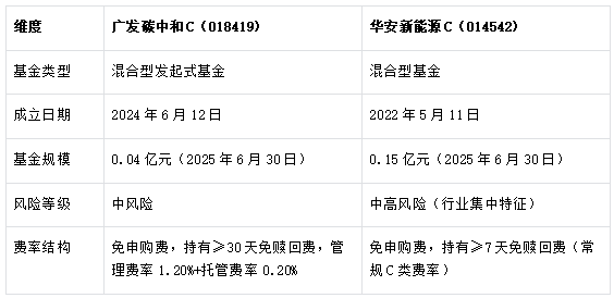 规模风险:广发碳中和C(018419)当前规模较小(0.04亿元),华安新能源C(014542)规模0.15亿元,均属于小规模基金,大额赎回可能引发净值异常波动,需关注后续规模变化。