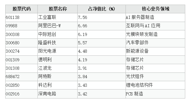 行业分布数据显示,该基金77.63% 的资产配置于制造业,这与其聚焦高端制造和AI硬件的投资方向高度一致。前十大重仓股中,与AI算力直接相关的标的占比较高,显示出基金经理对这一领域的深度布局。