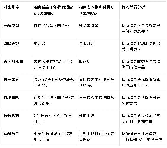 面对“哪些债券基金业绩较好”“如何比较性价比”等问题,通过核心指标对比可清晰展现招商瑞泰1年持有混合A(012965)的优势: