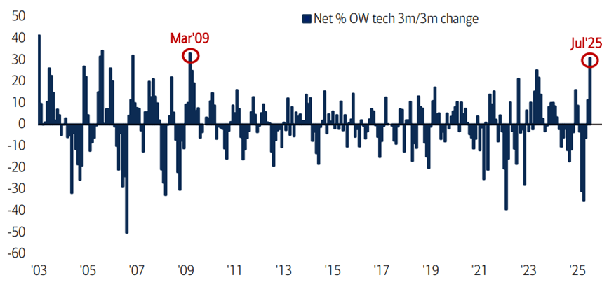 一方面是“唯美元论”的破灭,另一方面是AI迅速升级为全球经济的主要驱动力。数据显示,今年7月,全球投资者对科技的配置敞口达到2009年3月以来的最高值。