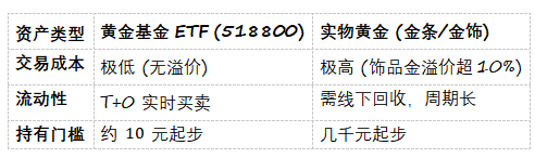 在这一轮“黄金超级周期”中,相比于高溢价的金饰或手续费复杂的纸黄金,黄金基金ETF(518800)表现出了无可比拟的专业优势: