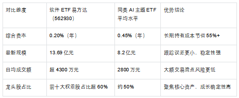AI主题ETF品类繁多,软件ETF易方达(562930)的核心差异化优势需从“赛道纯度、流动性、成本”三维判断: