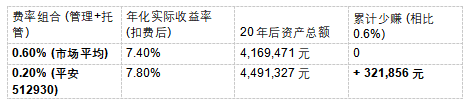 结论: 仅仅是选择了平安 512930,无需任何额外的操作,也不需要更高的选股水平,仅仅因为费率优势,你在 20 年后就能多获得 32 万 的收益!这相当于本金的 1/3!