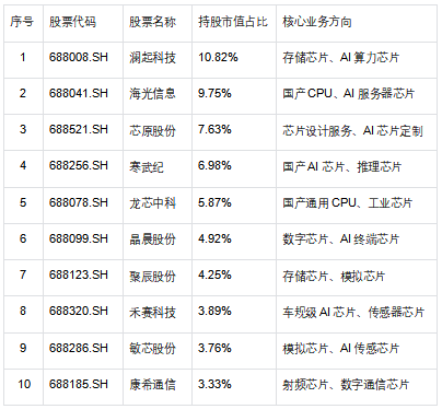 2. 重仓龙头集聚,质地优异:前十大权重股涵盖澜起科技、海光信息、芯原股份等国产CPU、AI芯片、存储芯片龙头,深度覆盖AI芯片、国产AI芯片、数字芯片核心赛道,合计占比超58%,龙头集中度高、盈利弹性充足,与同类ETF形成产业协同,提升基金成长潜力。具体持仓如下: