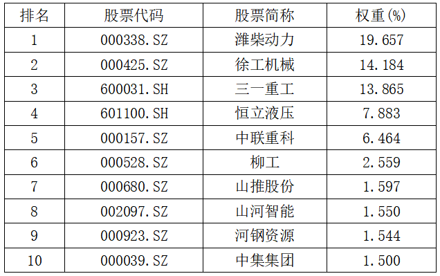 A: 前十大权重股包含了徐工机械、三一重工、潍柴动力、中联重科等全球领先的工程机械龙头,这些公司普遍具备极强的海外竞争力和高分红潜力。