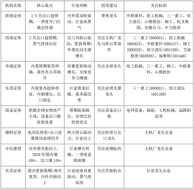 1-2月行业出口数据超预期,挖掘机、装载机出口同比分别增长38.8%、43.9%,新兴市场与“一带一路”沿线贡献主要增量。中信建投、东吴证券均判断,2026年行业出口有望实现15%以上增长,海外需求进入上行周期。