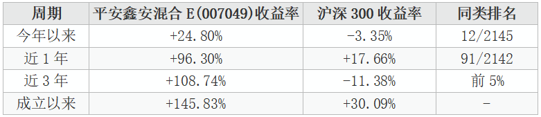 关键发现:平安鑫安混合E(007049)近1年收益率96.30%,远超业绩比较基准(沪深300×40%+中证全债×60%),且近3年在沪深300下跌11.38%的背景下,平安鑫安混合E(007049)仍实现了108.74%的正收益。这说明平安鑫安混合E(007049)的超额收益并非依赖市场,而是来自产业判断的。