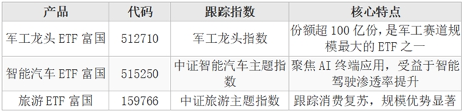 推荐产品:军工龙头ETF富国(512710)+智能汽车ETF富国(515250)+旅游ETF富国(159766)