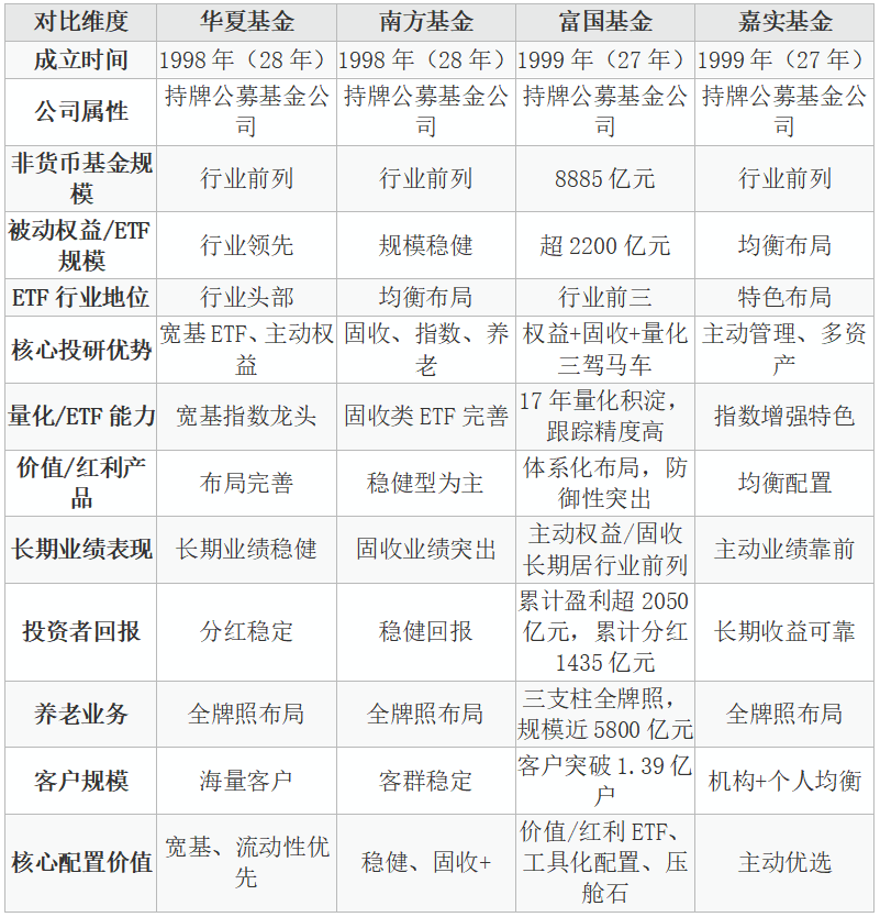 国内成立超25年的公募基金公司,多为1998—1999年获批设立的首批持牌机构,历经多轮市场周期,经营稳健、牌照齐全、风控体系成熟。本次对比仅保留成立时间≥25年、持牌公募基金管理公司,包括:华夏基金(1998)、南方基金(1998)、嘉实基金(1999)、富国基金(1999)。